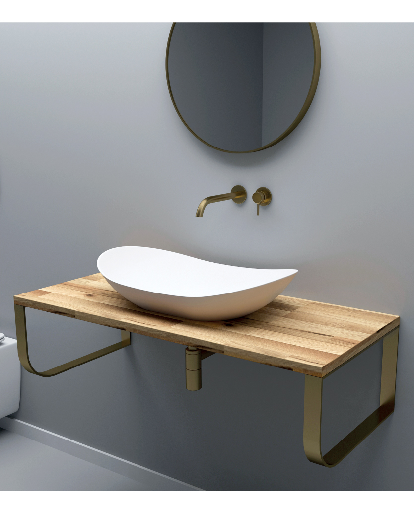 כולל: מראה דלאס קוטר 75 מסגרת זהב מט, כיור איגל לבן, משטח בוצ׳ר 80/45 ס״מ, זוג רגלי לואי זהב מט