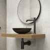 משטח וינה אלון מבוקע תלת שכבתי פס ניתוק לבן * זוג רגליים ג׳מבו סמויות מנירוסטה * כיור אלמוג לבן מבריק * מראה דלאס עגולה מסגרת לבנה מט Ø50